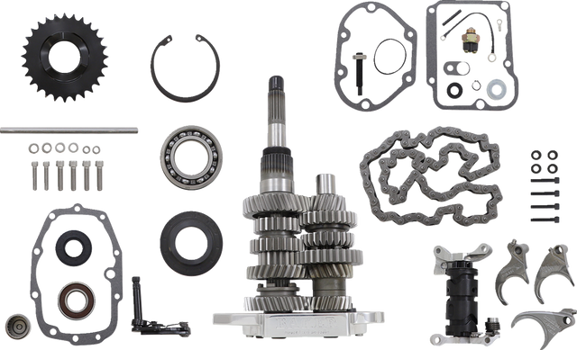 - Includes a polished trap door, 6-speed gear set (3.24:1 1st gear/.86:1 6th gear), 28-tooth motor sprocket, longer primary chain, adjusting shoe, fixed spindle-shift drum and anti-overshift ratchet shift pawl assembly