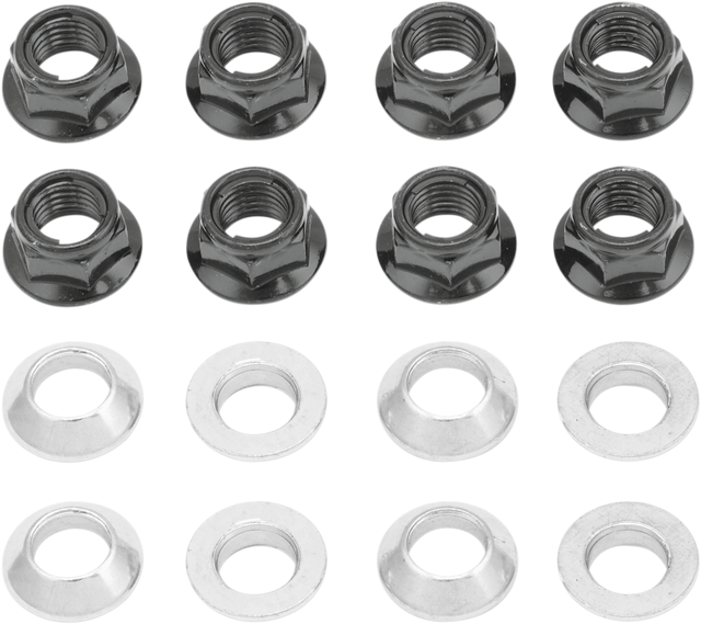 • Designed to eliminate the troublesome problem of lugs that work their way loose, these kits include eight metal locking flange nuts and eight tapered adapter bushings