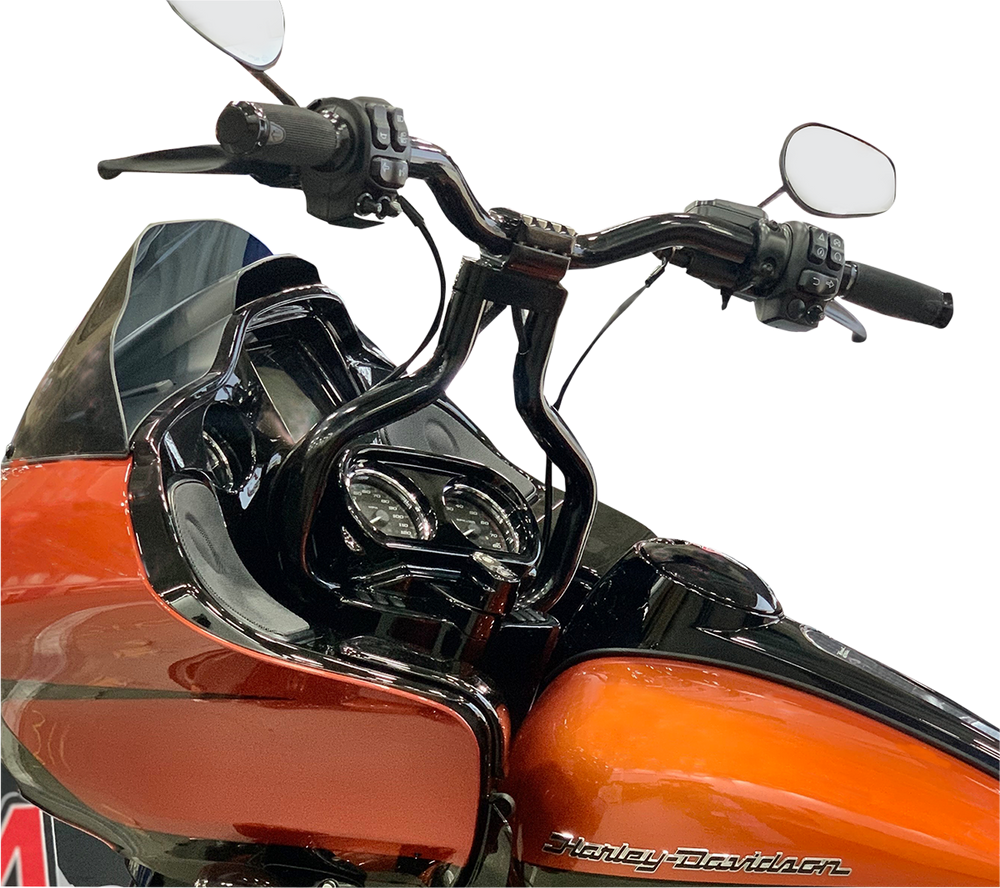 • Handlebar wraps around gauges, uses stock handlebar mount/riser