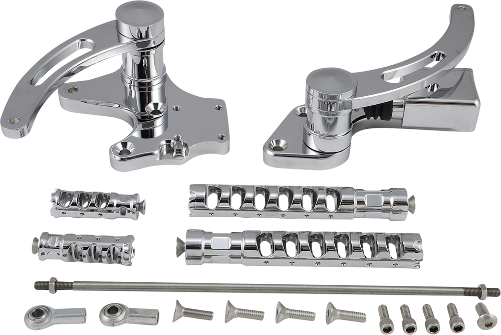 - Includes chrome-plated billet master cylinder (unless noted), slotted shift, and brake arms with Muzzle brake foot and toe pegs along with shift linkage and mounting hardware