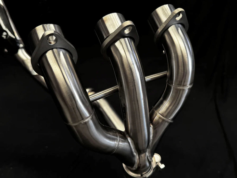 VANDEMON offers a complete exhaust system featuring striking polished 304 Stainless Steel headers and a brushed finish Stainless Steel muffler. This system enables unrestricted exhaust flow, delivering maximum sound and performance. This exhaust system deletes the heavy catalytic converter, significantly reducing weight, leading to improved handling, reduced stopping times, and increased acceleration.