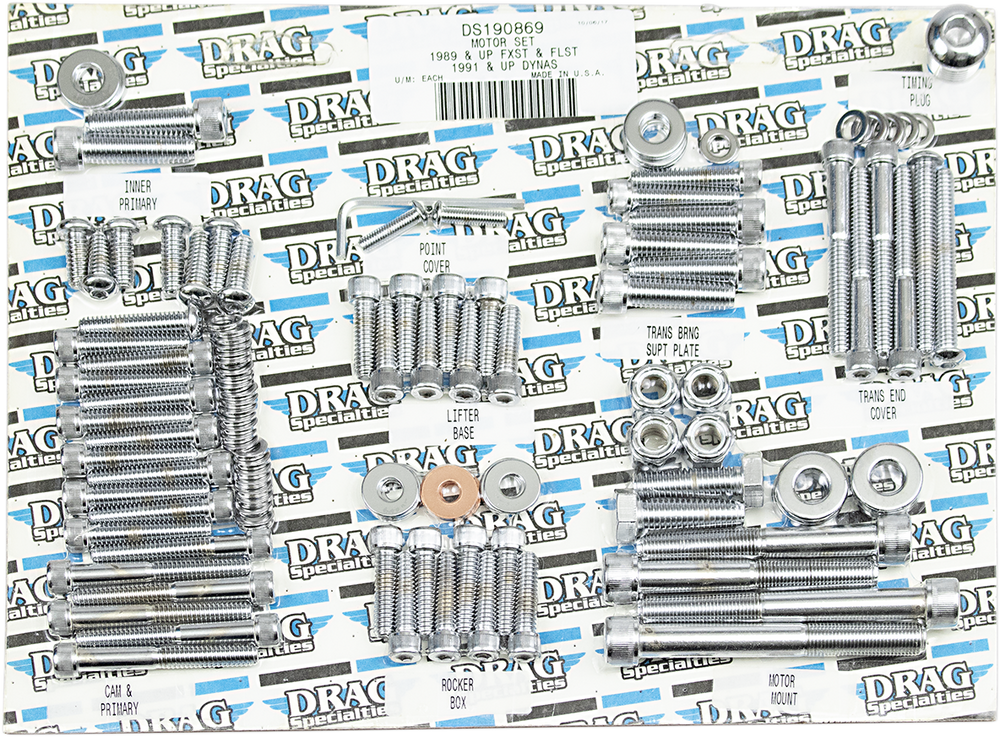 • Complete motor sets for 87-94 Big Twin include bolts for cam, primary, point, clutch, inspection and chain covers, lifter base, inner primary, top front and rear motor mounts, timing plug and header mount screws