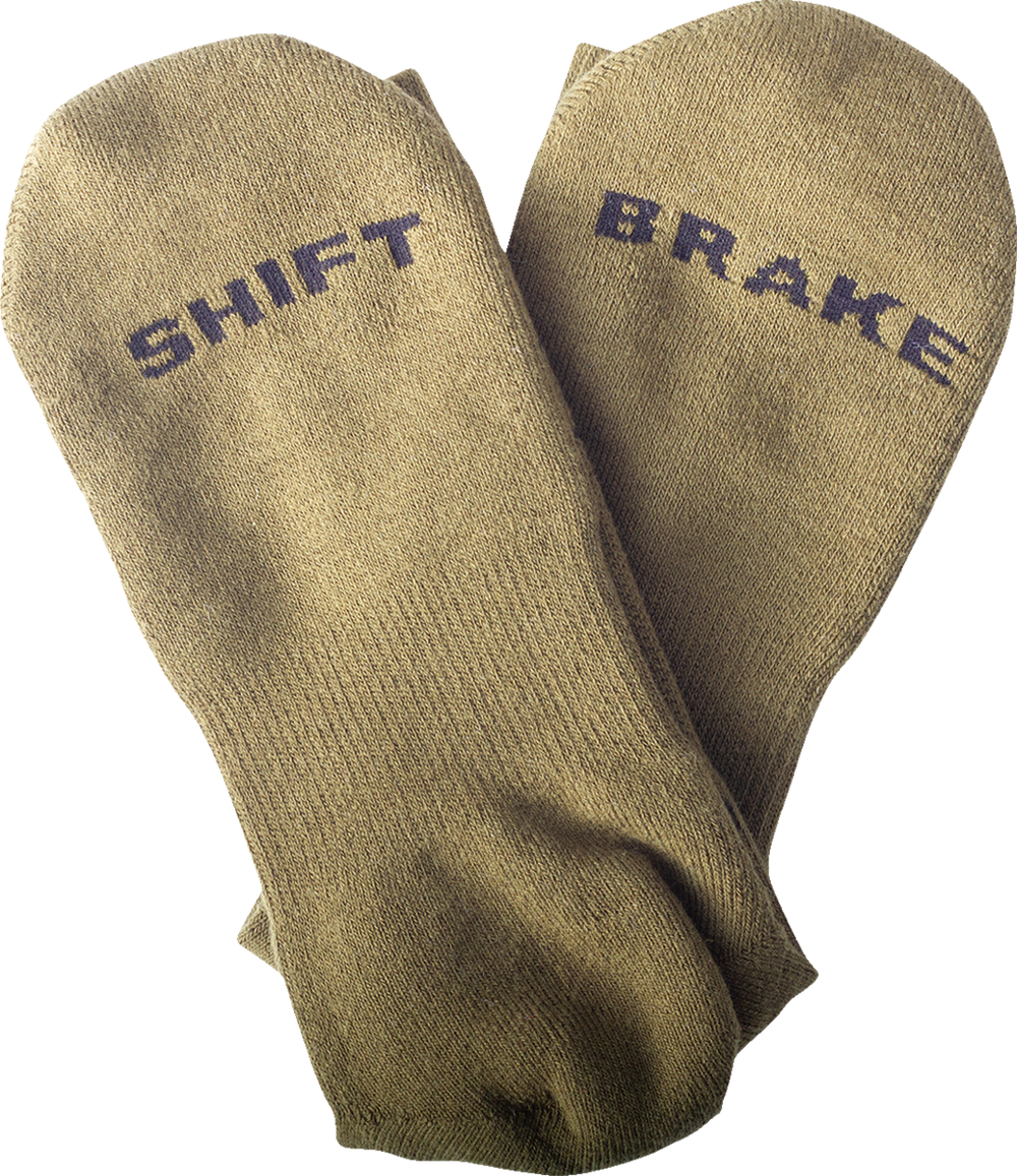 - Shift knitted on bottom of right sock, Brake knitted on bottom of left sock