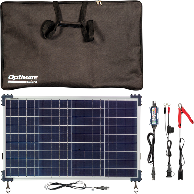 - includes polycrystalline solar panel assembly with aluminum frame, suction for mounting, OptiMate Solar DUO controller, O-04 battery clips, O-01 battery lead, and carry bag