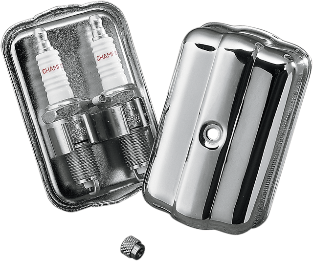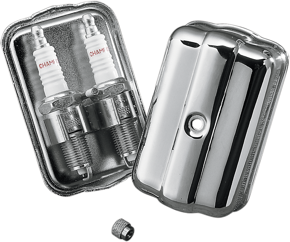 • A chrome-plated replica of the spark plug holder found on early Panheads, updated to accept even late-model Shovelhead deep-reach plugs
