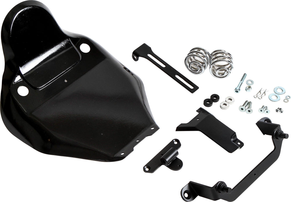 These kits make the clean installation of a sprung solo seat a cinch. The kits include a frame cover, front seat mount, springs, (unless solid mount application) rear bracket and hardware. Suitable for most solo seats (sold separately) with 7 spring mounting post spacing.