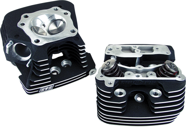 High port flow gives great performance now, and more later when additional upgrades are done Heads are fully assembled with springs and valves Compression ratios vary depending on cylinder heads chosen, pistons used and engine displacement; see Compression Ratios chart for specifications 79cc heads work great with stock motors for 88" to 103" motors; 89cc heads work best for motors over 103" or with high-compression pop-up pistons 79cc have 1.940" intake and 1.575" exhaust valve and springs for up to .640" lift; 89cc have 2.000" intake and 1.605" exhaust and .640" springs Heads are machined for compression releases unless noted otherwise (sold separately); S&S rocker boxes required when using S&S compression releases Do not include rocker arm components, intake manifold or gaskets Heads include four long headbolts, and reuse four long OEM headbolts Accept OEM intake manifolds Made in the U.S.A. Must use S&S rocker boxes (PART #90-4110) if S&S compression releases are used. Not compatible with Twin Cooled heads.