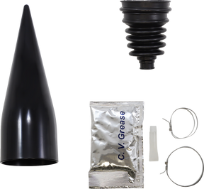 - Kit includes one universal boot, one reusable cone tool, two stainless steel clamps, grease pack, and silicone cone lube and instructions