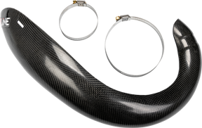 Our dirt bike exhaust pipe guards are manufactured using a hand laid mix of carbon, Kevlar and our unique high-temperature resistant resins. A total of 5 layers to be exact. This combination creates good looking, durable and clean fitting guards that will protect your expansion chamber from power-robbing dents and dings. Compared to other exhaust pipe guards, the E Line Accessories carbon fiber pipe guard is lighter and more durable with a 75-percent greater tensile strength from any of the metal units we have tested. It is “real carbon fiber.” Our carbon/Kevlar components are designed to be installed in a matter of minutes without removing the exhaust. A pair of stainless steel clamps are all that is needed to add durable, lightweight protection to the expansion chamber of your favorite motorcycle. Installation instructions are available on our web site videos.